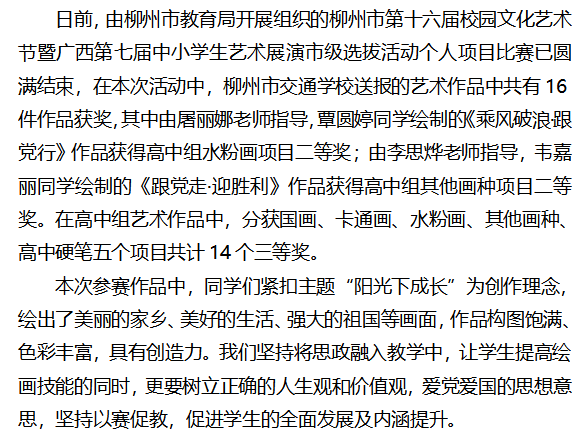 柳州市交通学校在市第十六届校园文化艺术节暨广西第七届中小学生艺术展演市级选拔活动个人项目比赛中荣获佳绩