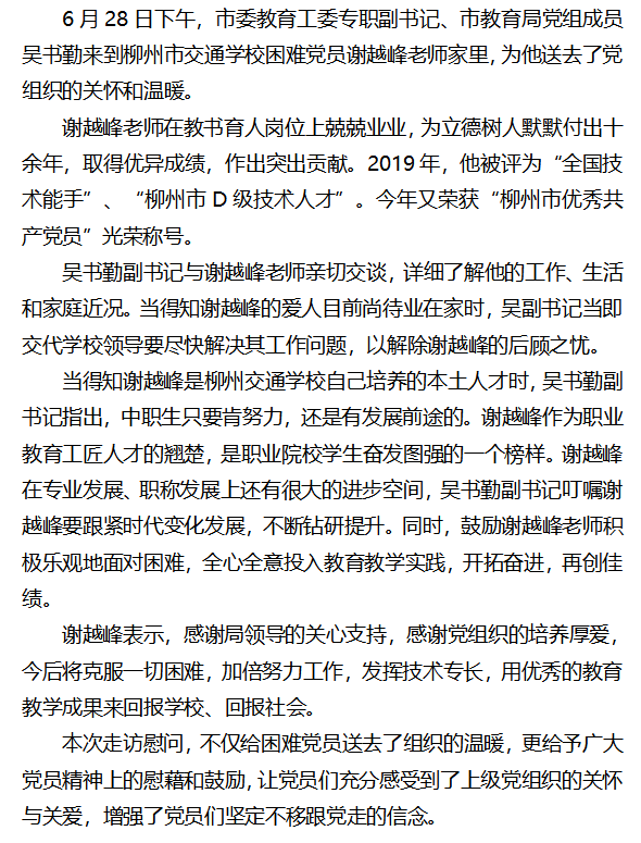 组织关怀送到家 真情关爱暖人心 --柳州市委教育工委专职副书记、市教育局党组成员吴书勤走访慰问市交通学校困难党员谢越峰