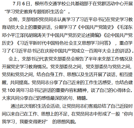 公共基础部党支部开展党史学习教育专题组织生活会