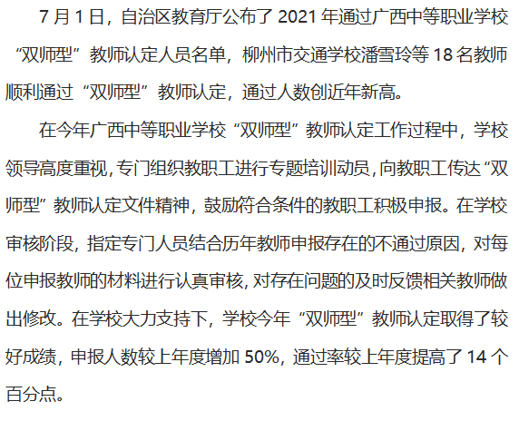 柳州市交通学校教师通过区“双师型”教师认定人数创近年新高