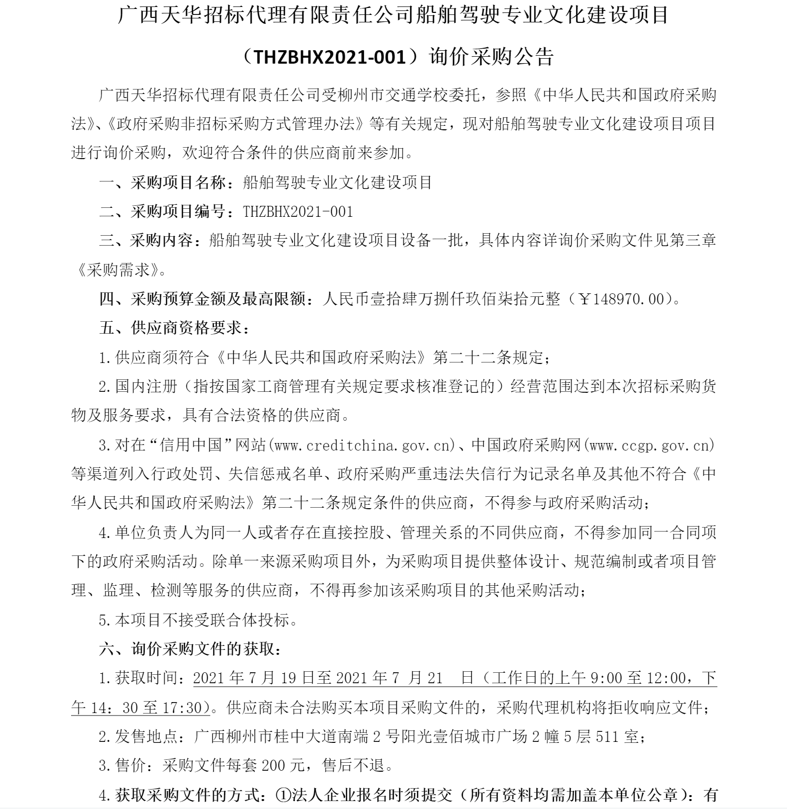 广西天华招标代理有限责任公司船舶驾驶专业文化建设项目 (THZBHX2021-001)询价采购公告