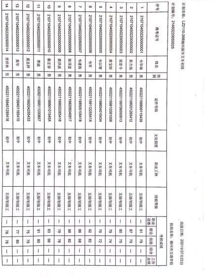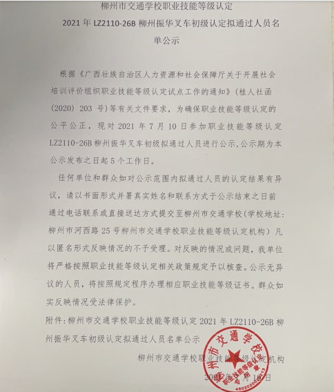 柳州市交通学校职业技能等级认定2021年二十六期叉车初级认定拟通过人员名单公示