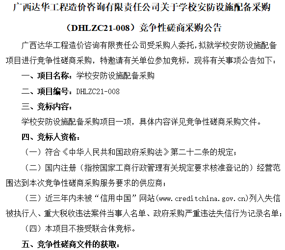 广西达华工程造价咨询有限责任公司关于学校安防设施配备采购(DHLZC21-008)竞争性磋商采购公告