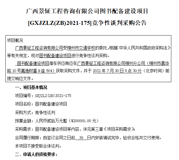 广西景钲工程咨询有限公司图书配备建设项目[GXJZLZ(ZB)2021-175]竞争性谈判采购公告