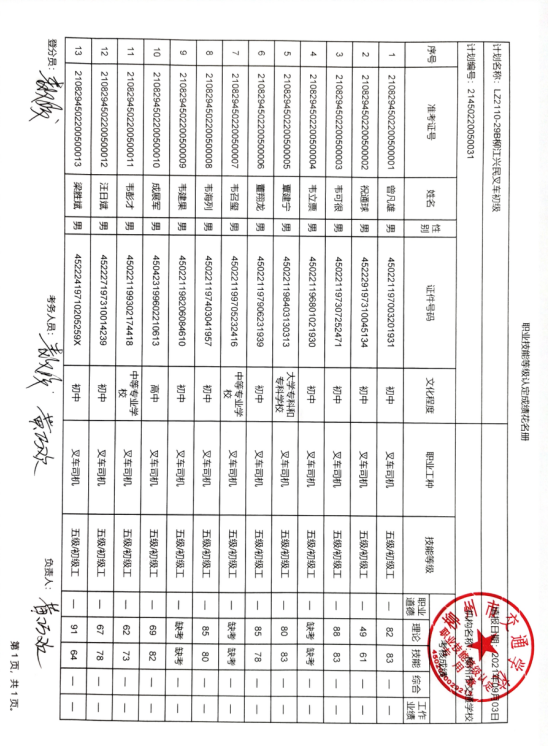 柳州市交通学校职业技能等级认定2021年LZ2110-29B柳江兴民叉车初级认定拟通过人员名单公示