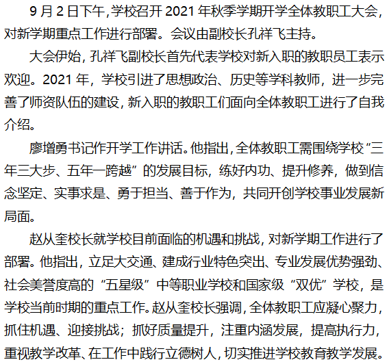 学校召开2021年秋季学期开学全体教职工大会