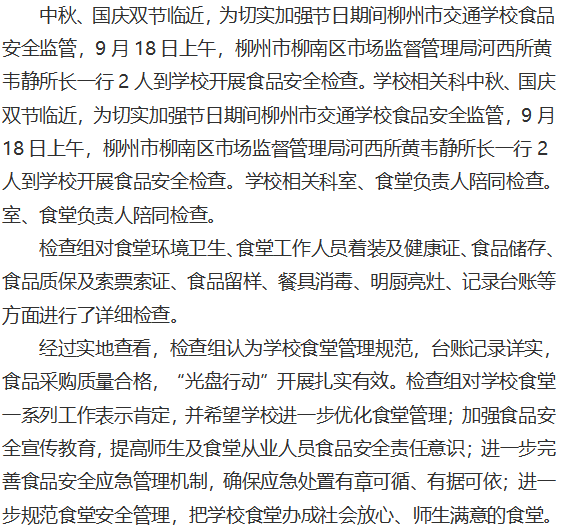 柳州市柳南区市场监督管理局到学校开展食品安全检查