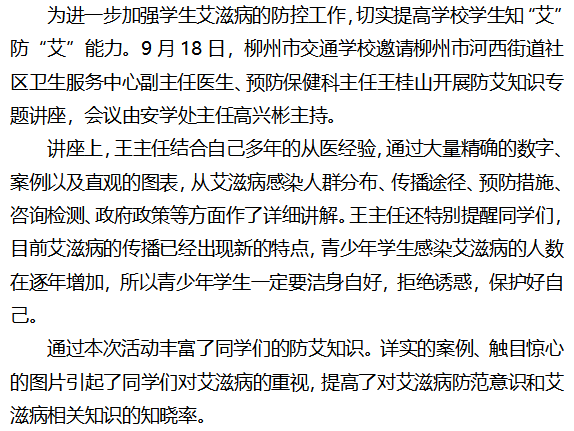 关注青少年 预防艾滋病--柳州市交通学校开展学生防艾知识讲座