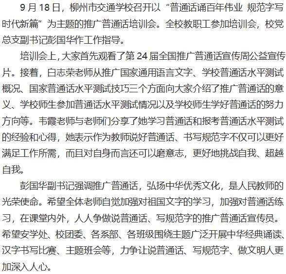 普通话诵百年伟业 规范字写时代新篇 ——柳州市交通学校召开推广普通话培训会
