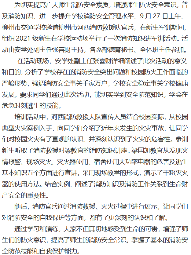 柳州市柳州市交通学校组织开展 2021年秋季学期“消防进军训”活动
