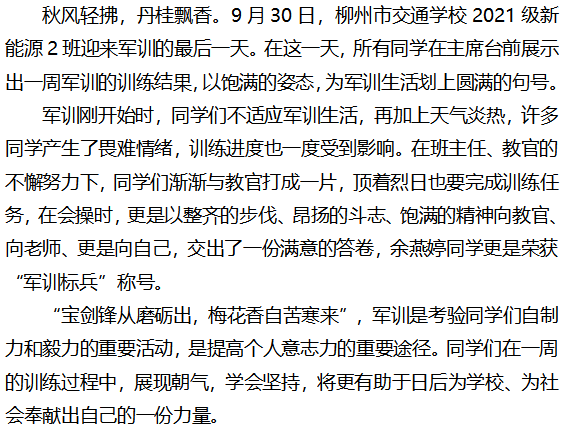 致青春,亮风采 ——柳州市交通学校21级新能源2班圆满完成军训任务