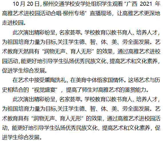 在艺术中接受熏陶洗礼 在美育中提升校园品位 --柳州交通学校组织开展2021年秋季高雅艺术进校园活动