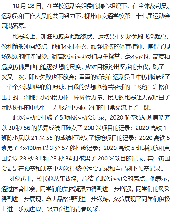 青春不散场 闭幕不落幕 --柳州市交通学校第二十七届运动会圆满结束