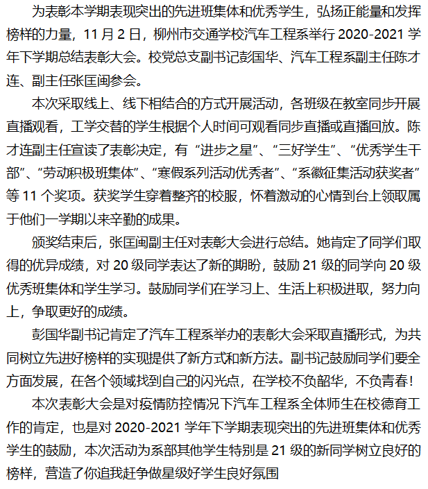 表彰先进 树立榜样 --柳州市交通学校汽车工程系举行总结表彰大会