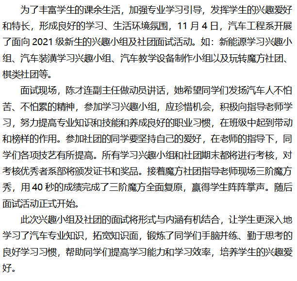 全面发展 丰富职校新生活 ——柳州市交通学校汽车工程系兴趣小组及社团开展面试活动