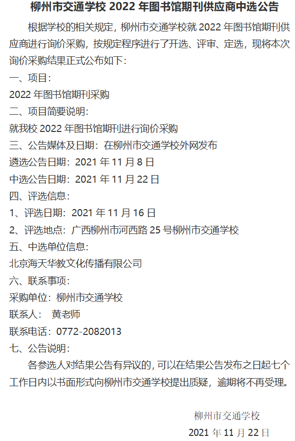 柳州市交通学校2022年图书馆期刊供应商中选公告