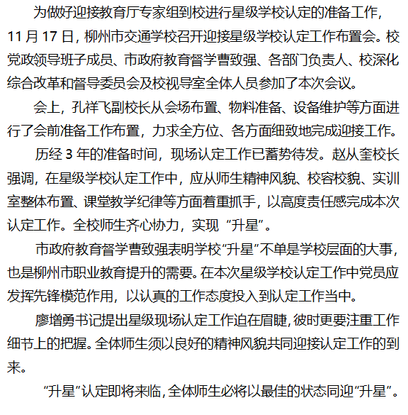 齐心协力 共迎“升星” --柳州市交通学校召开迎接星级学校认定工作布置会