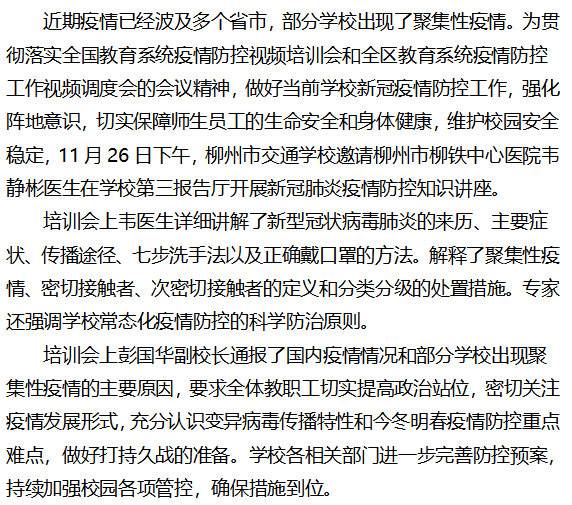 我为群众办实事|疫情防控 人人有责 ——柳州市交通学校开展新冠肺炎疫情防控知识讲座