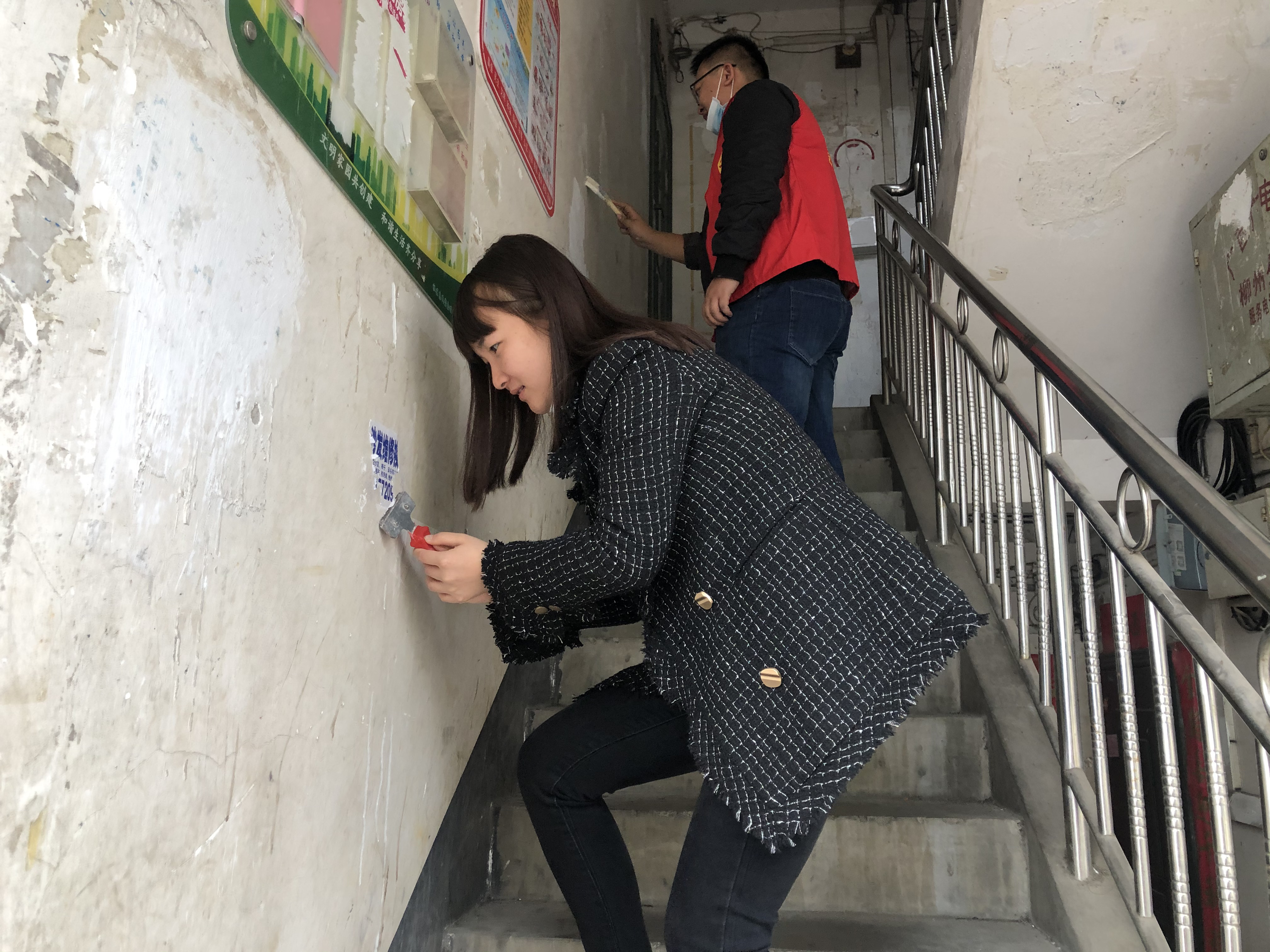 党员志愿者们对楼道小广告进行清洁