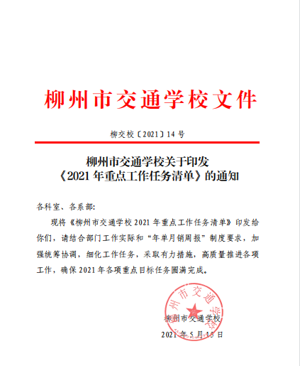 今年年初,为进一步推进内部质量保证体系诊断与改进,加强顶层设计,增强工作统筹性、计划性和执行力,促进精细化、科学化管理,提高工作效率,确保各项决策部署和“星级学校”等目标任务不折不扣照单落实,学校发布并实施《柳州市交通学校关于印发2021重点工作任务清单的通知》,将学校年度目标计划分解落实到各部门重点工任务中,形成量化指标,并落实到月。