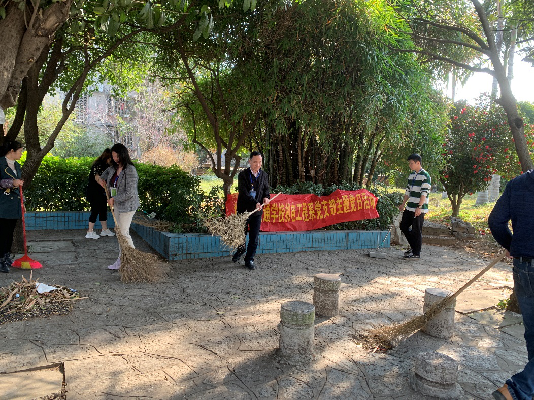 党员们和学生志愿者纷纷拿起扫把、铲子对学校展望楼、读书走廊和电梯实训室周边的草坪进行树叶、垃圾进行彻底清扫,把负责的区域都收拾得干干净净,让校园面貌焕然一新。