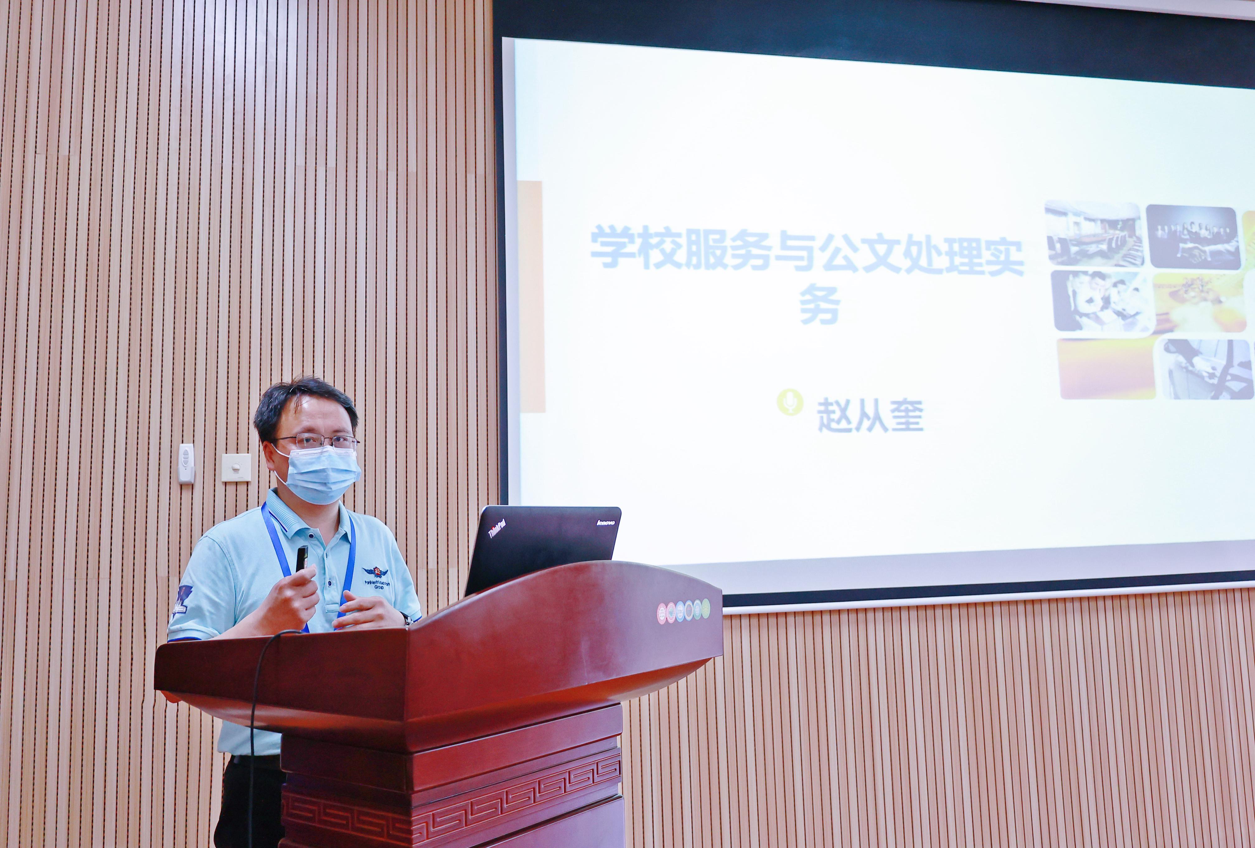 校长赵从奎作“学校服务与公文处理实务”的专题培训。赵从奎校长以一段“老爷爷善意搬石头,男女以善还善”的短视频为导入,引起在座干部的思考,指出大家作为一名干部,不仅要有孝顺、善良的品质,还要抛弃事不关己高高挂起的想法。随后赵校长拿“服务”与“工作”进行对比,开始了行政工作实务的培训讲授。赵校长通过结合他丰富的行政工作经历,分享工作经验,让与会人员受益匪浅。