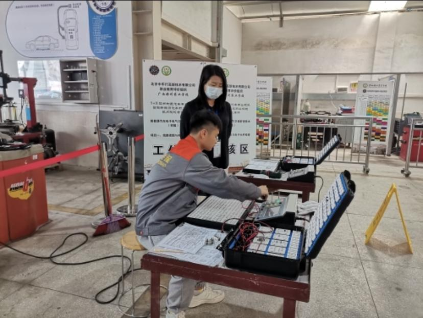 本次考评共有40名考生,考评内容为模块2-3新能源汽车电子电气空调舒适技术。张匡闽副主任担任本次考评的督导工作,考前对广西梧州农业学校的场地设备准备情况、疫情防控工作、应急预案等工作进行检查,同时,把学校1+X考评工作的优势与经验与广西梧州农业学校的领导、老师进行分享。本次考核最终有35名考生顺利通过。