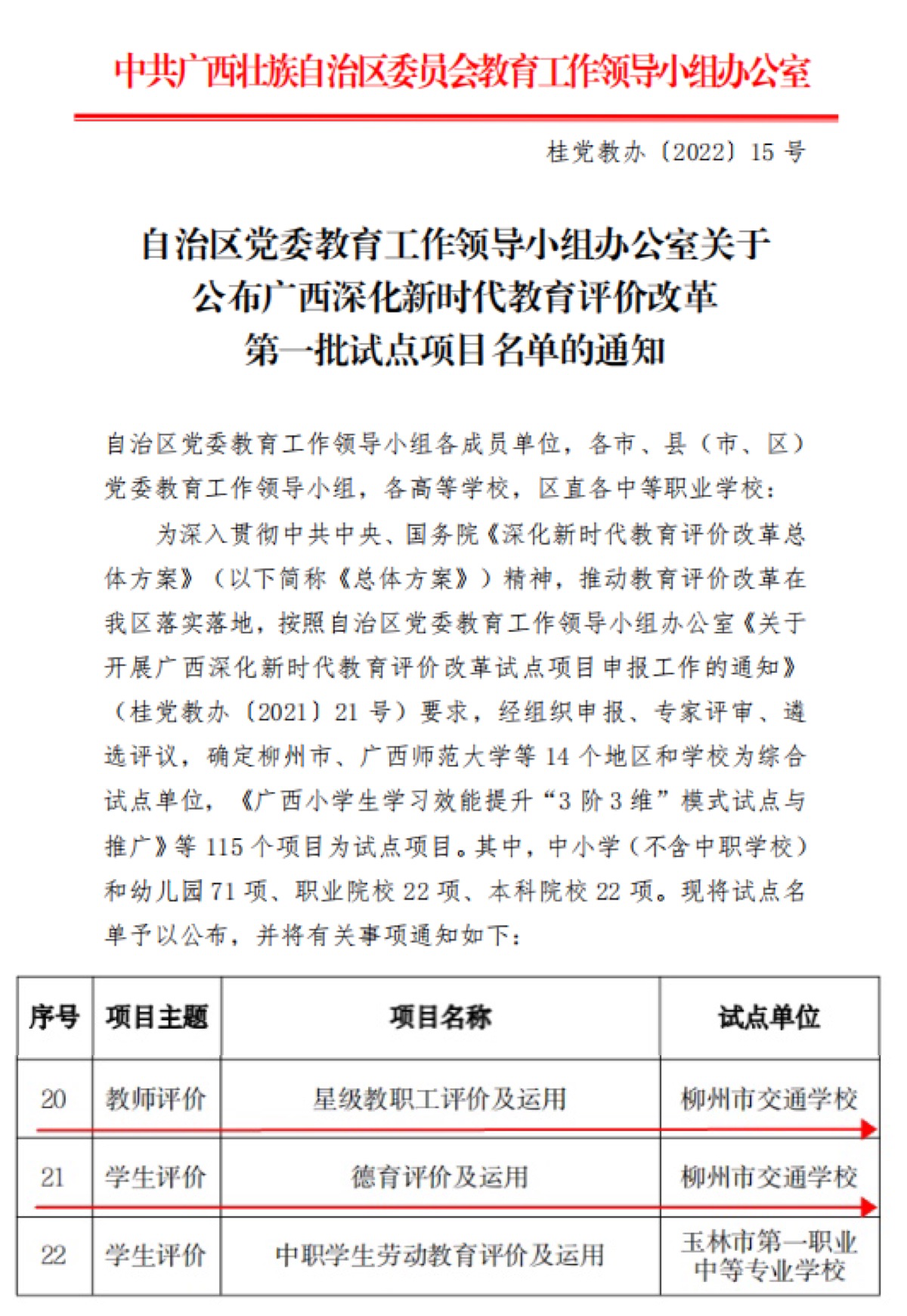 近日,中共广西壮族自治区委员会教育工作领导小组办公室公布了广西深化新时代教育评价改革第一批试点项目名单,我校“星级教职工评价及运用”、“德育评价及运用”获批为广西深化新时代教育评价改革第一批试点项目。