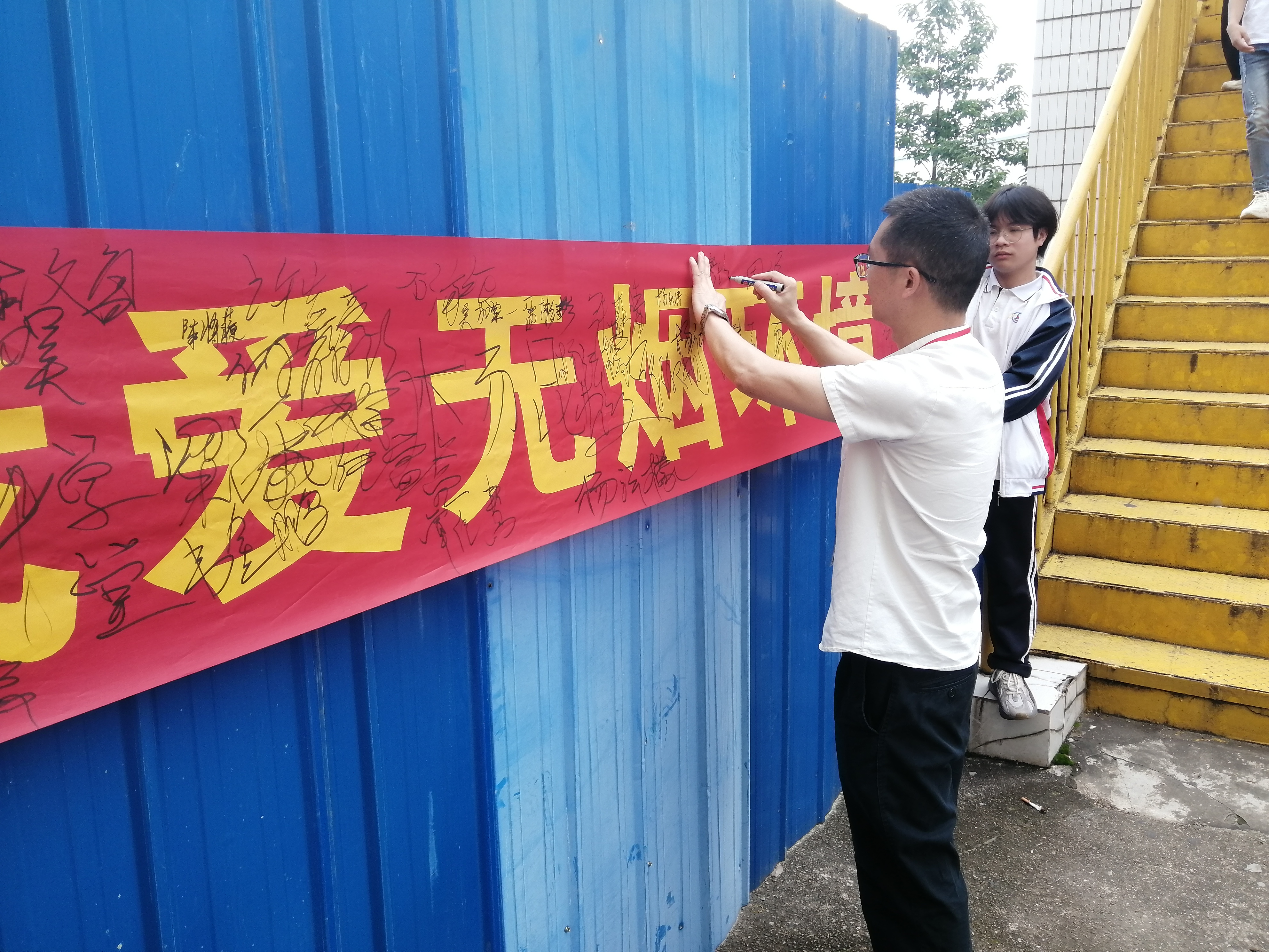 在学校图书馆门口,学生志愿者给师生普及烟草对家人对环境的危害、控烟的好处等科普知识,发出无烟学校建设的倡议,师生在“我爱无烟环境”“拒绝烟草危害”、“做不吸烟新一代”横幅大签名活动,积极鼓励身边吸烟的家长朋友尽早戒烟。