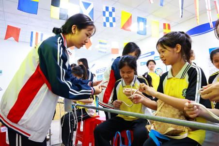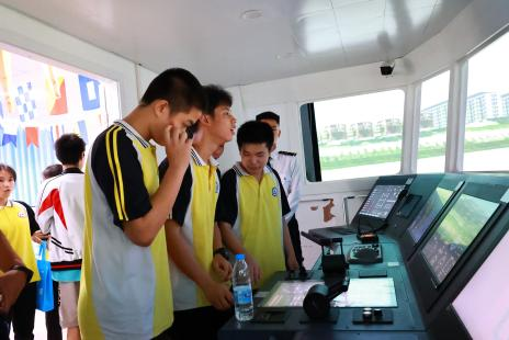 船舶驾驶基地被层层包围,面对这个新奇的“大家伙”,好奇的学生们不断发问:“老师,船要怎么开?”,“绳结要怎么打?”船舶驾驶专业老师耐心地为学生们一一讲解演示。