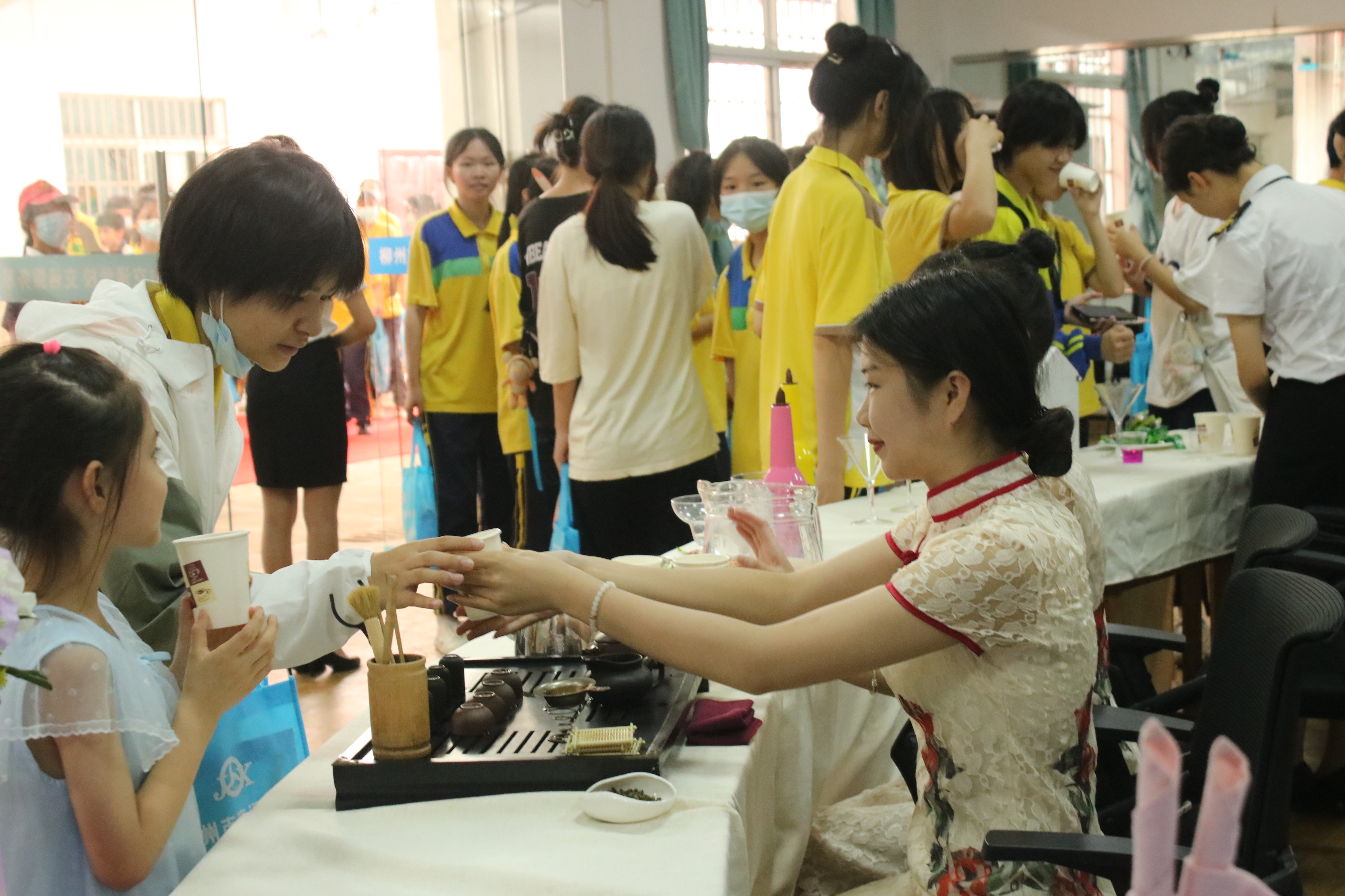 冲泡、调制、品尝……清幽茶香扑鼻而来,交通服务系的同学正在有条不紊地展示泡茶的精致过程,舒缓的音乐配合优雅的姿态,让学生们在细细品味的同时深刻体会到:一杯茶不仅是休闲文化的代表,更是对品质生活的追求。