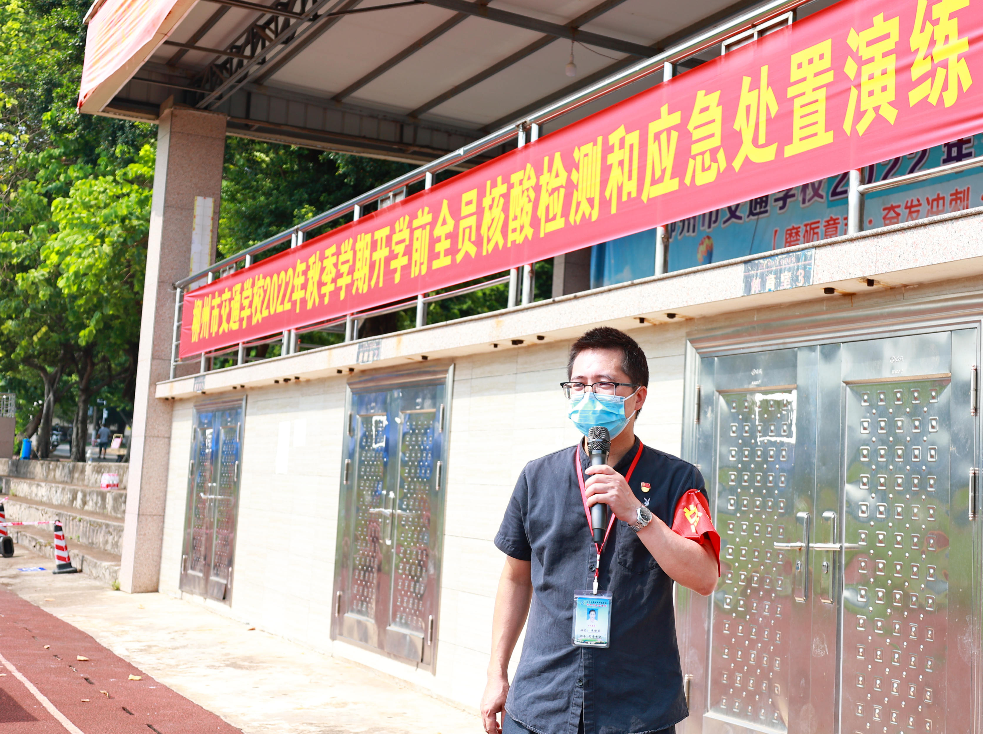 演练开始前,参演教职工在指挥部前集合,由学校演练指挥部召开疫情防控演练准备会,介绍演练方案,让教师们熟悉演练场景流程。此次演练模拟全校师生全员核酸检测和应急处置演练等场景演练。