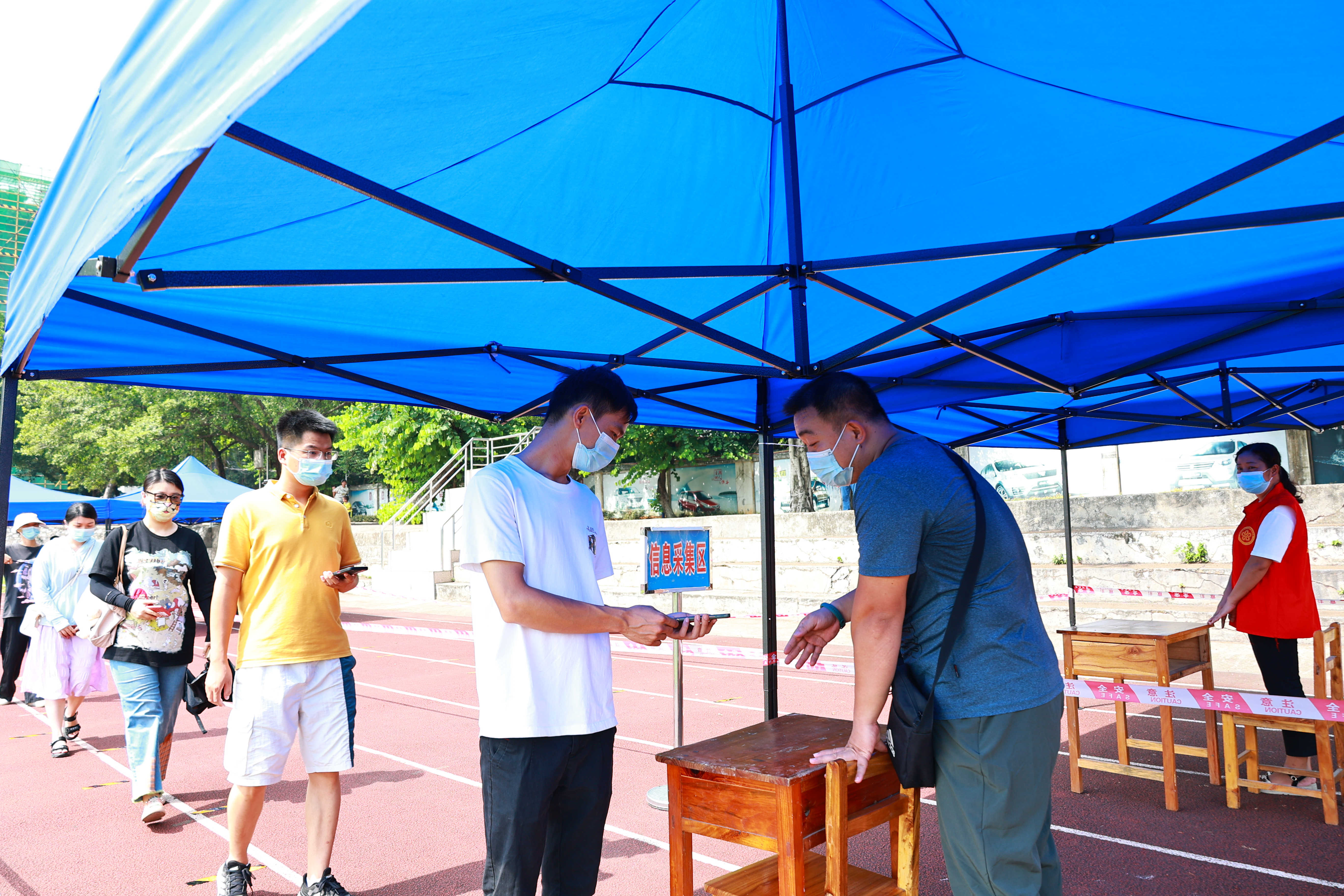模拟核酸采样检测演练开始,班主任及老师按指挥员通知的顺序,依次组织学生到指定地点进行采样。大规模核酸检测流程为:排队等待——扫描“桂核酸”码——十人混检绑管——采集核酸。核酸检测后,学生们在带队老师的组织下有序返回教室。此外还进行了模拟学校大门“两码联查”应急处置演练和教室体温异常人员应急处置演练。