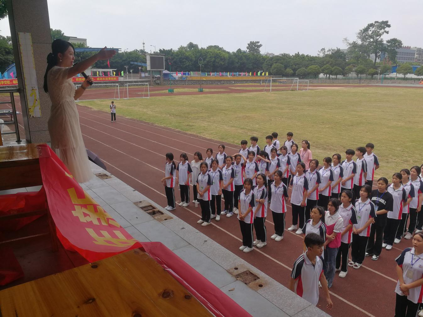 9月9日上午,交通服务系师生正在为即将到来的教师节、中秋节积极准备着节目。同学们在易敏婷老师的带领下,排着整齐的队形,跟着音乐的节拍做着优美的手势。虽然烈日炎炎,同学们在排练时被太阳晒得睁不开眼睛,可是眼神都无比坚定,脸上洋溢着幸福的表情。