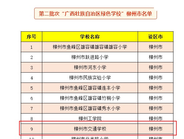 近日,广西壮族自治区教育厅公布第二批次“广西壮族自治区绿色学校”名单,柳州市交通学校被认定为第二批次“广西壮族自治区绿色学校”。