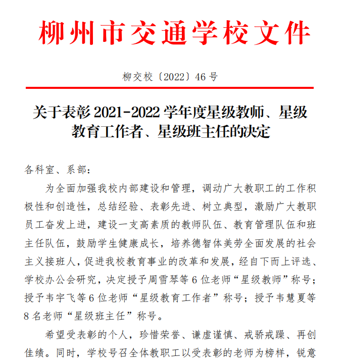 12月27日,学校发布了《关于表彰2021-2022学年度星级教师、星级教育工作者、星级班主任的决定》(柳交校〔2022〕46号),通知指出,经自下而上评选、并由学校办公会研究,学校决定授予周雪琴等6名老师“星级教师”称号;授予韦宇飞等6名老师“星级教育工作者”称号;授予韦慧夏等8名老师“星级班主任”称号。