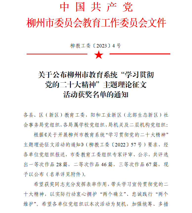 根据《关于开展柳州市教育系统“学习贯彻党的二十大精神”主题理论征文活动的通知》(柳教工委(2022)57号)要求,市教育局组织开展2022年柳州市“学习贯彻党的二十大精神”征文活动,柳州市交通学校教师踊跃参与,并在活动中斩获佳绩,获得一等奖1项、二等奖4项,三等奖3项。