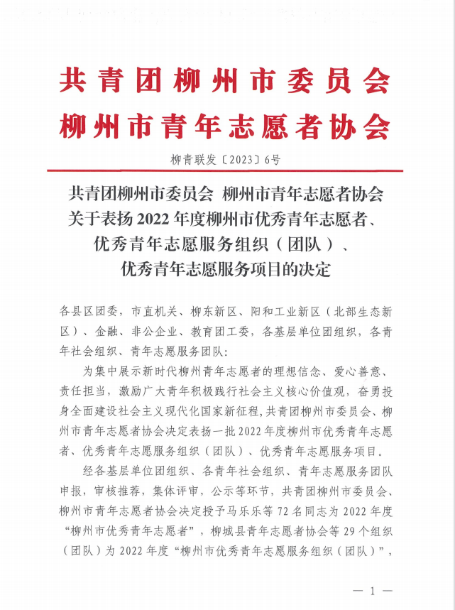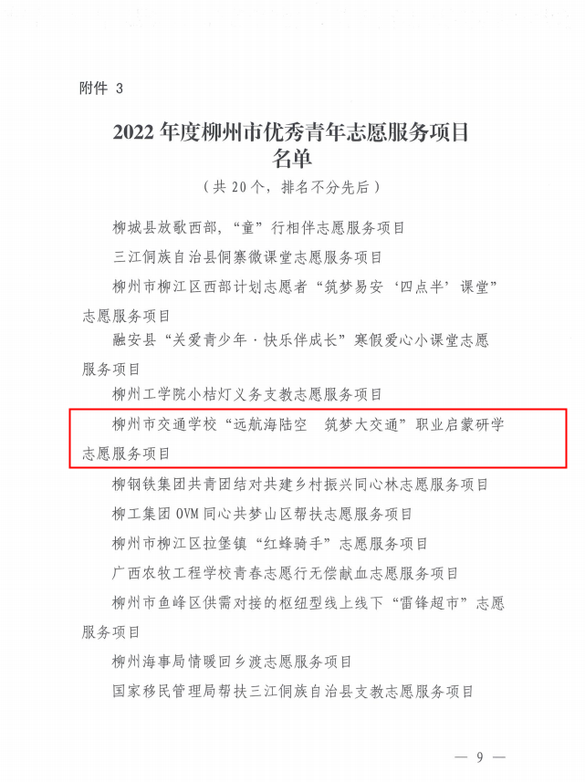 近日,共青团柳州市委员会、柳州市青年志愿者协会对2022年度柳州市青年志愿者优秀个人奖、组织奖、项目奖评选表扬名单进行公示,我校“远航海陆空 筑梦大交通”职业启蒙研学志愿服务项目获评柳州市优秀青年志愿服务项目。