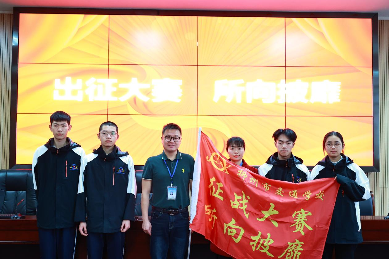 校长黄䶮为参赛选手代表、指导老师代表授出征旗,旗帜承载了选手们不断奋斗、追求卓越、精益求精的精神。
