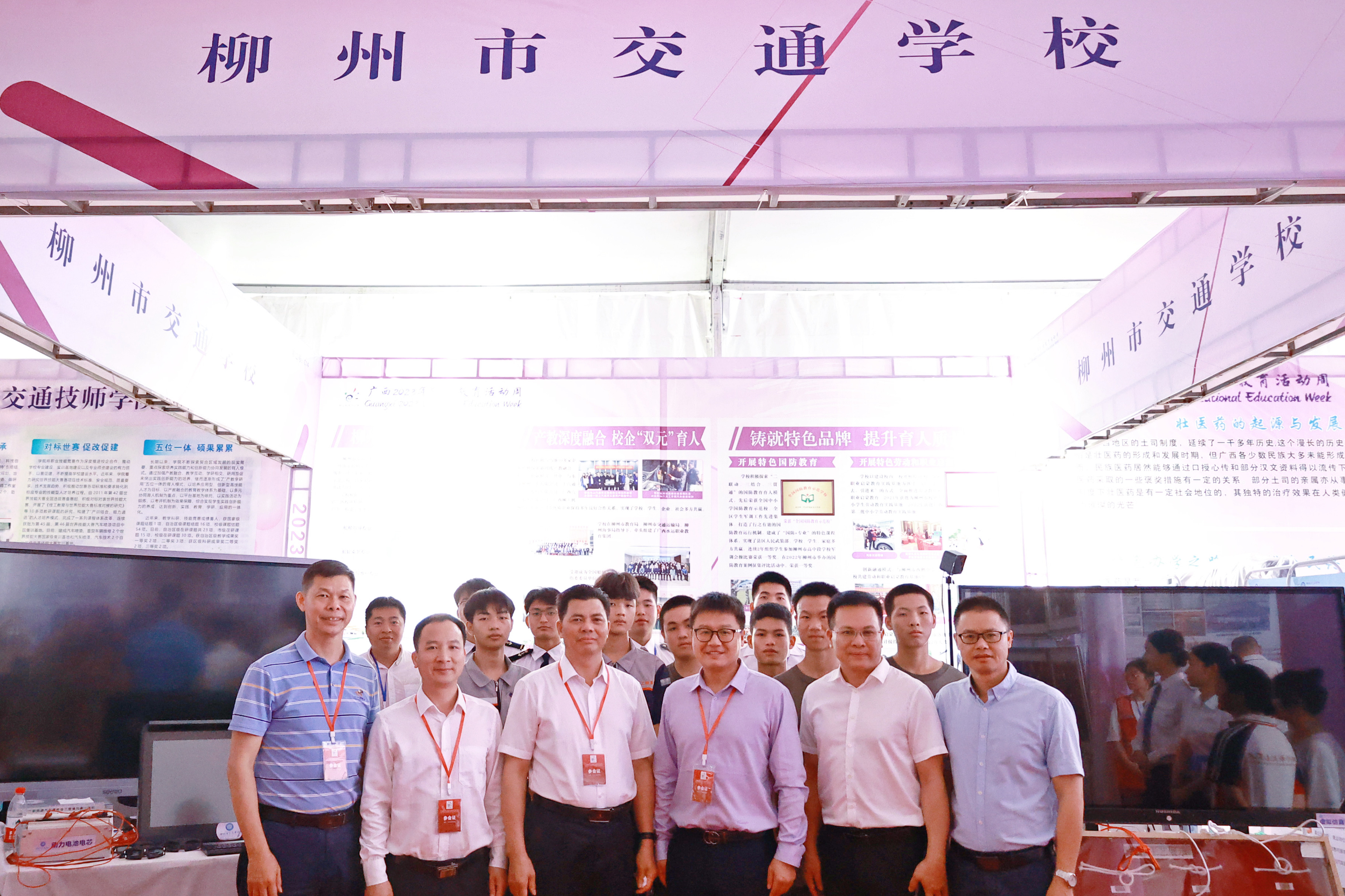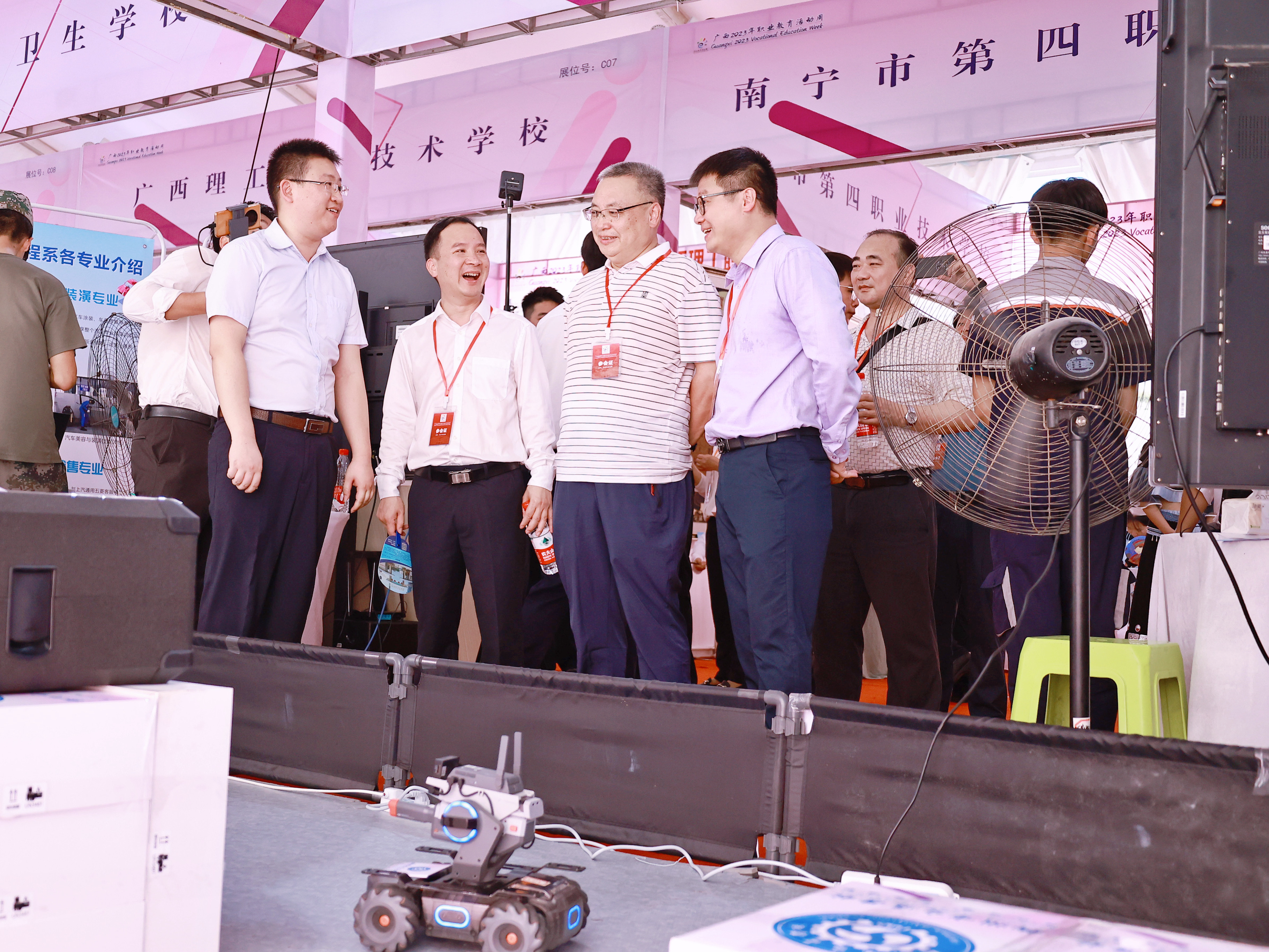 自治区党委教育工委书记、教育厅党组书记、厅长刘友谊莅临我校展区参观指导时,现场观看了展品演示,我校校长黄䶮介绍了学校的专业特色、发展前景、教育教学成果和专业水平。教育厅职成处副处长廖造壮 、教育厅职成处主任郭进磊、柳州市教育局调研员曾建胜、兄弟院校领导等众多参观人员对我校展示“机甲大师对抗赛”、“无人机飞行展示”、“VR体验”、“电池医院电芯原理”等项目都产生了浓厚的兴趣,我校展区成为打卡热点,门庭若市。