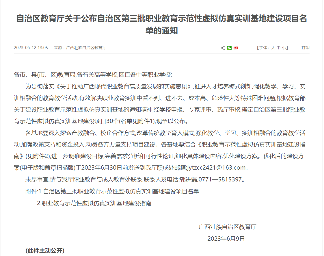 近日,广西壮族自治区教育厅公布了自治区教育厅第三批职业教育示范性虚拟仿真实训基地建设项目,我校新能源汽车运用与维修专业成功获批建设“新能源汽车检修技术虛拟仿真实训基地”。