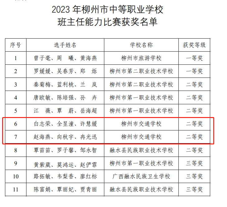 2023年柳州市中等职业学校班主任能力比赛获奖名单