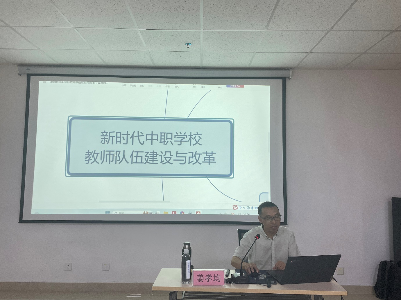 当天下午来自贵州航天职业技术学院的姜孝均副教授进行了专题讲座,围绕新时代中职学校教师队伍建设与改革展开授课。他分享了一些成功的教科研经验和策略,以实践案例拓宽了老师们在教科研中选题、构思、理论研究和实践应用等方面的思路,引导他们更好地适应时代职业教师发展的需求。