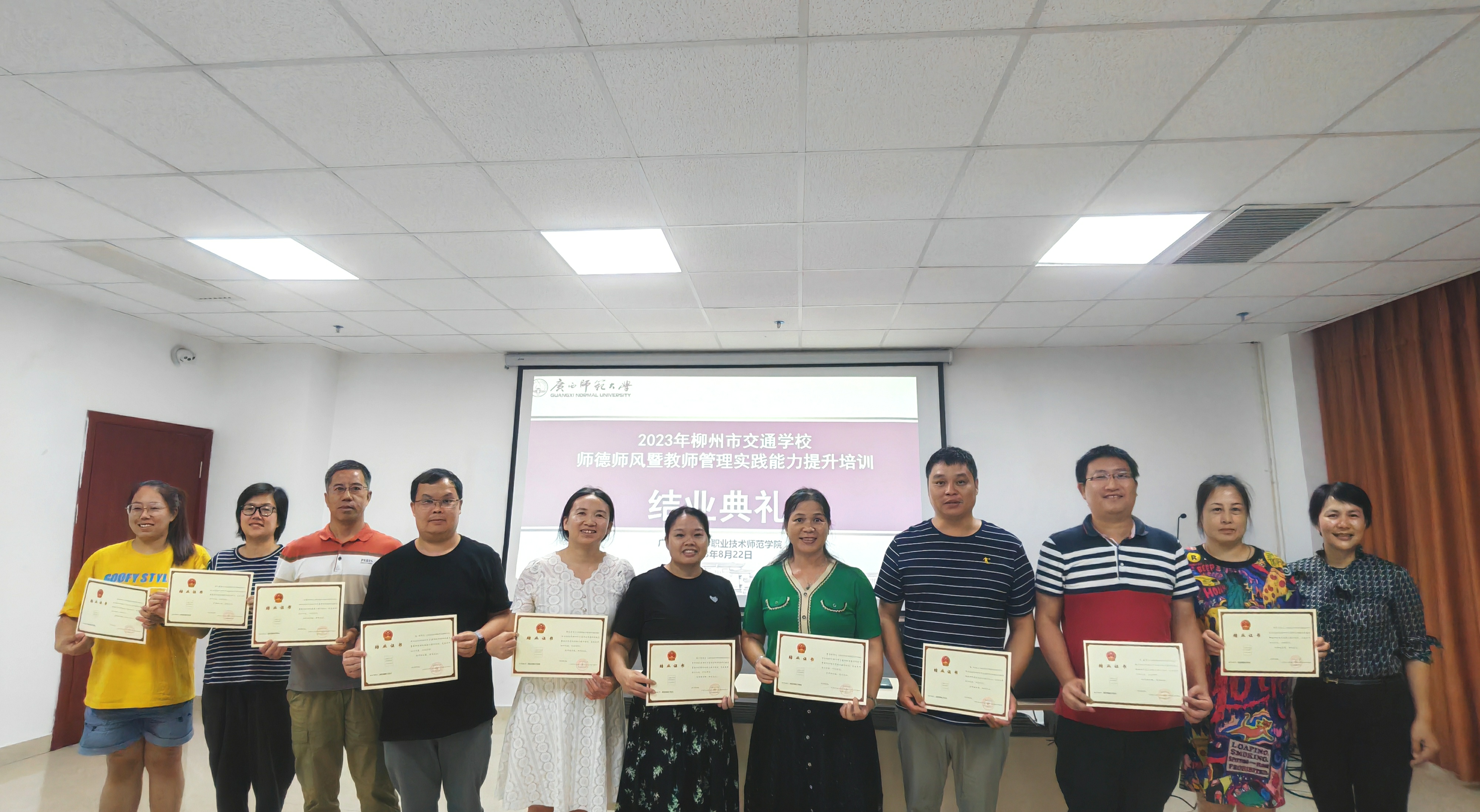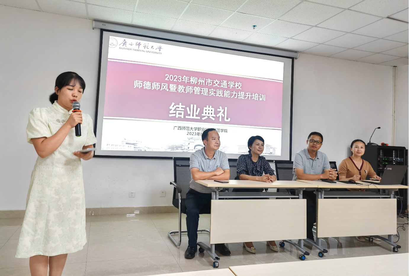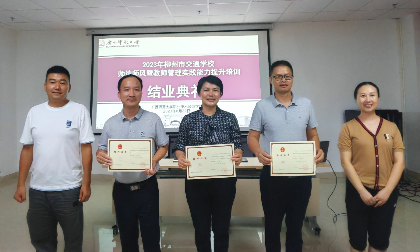 在晚上的结业典礼上,胡柳琼老师代表学员做学习总结与收获分享,罗柳建副校长做总结讲话,随后广西师范大学的容华主任和学校领导给参训教师颁发结业证书。
