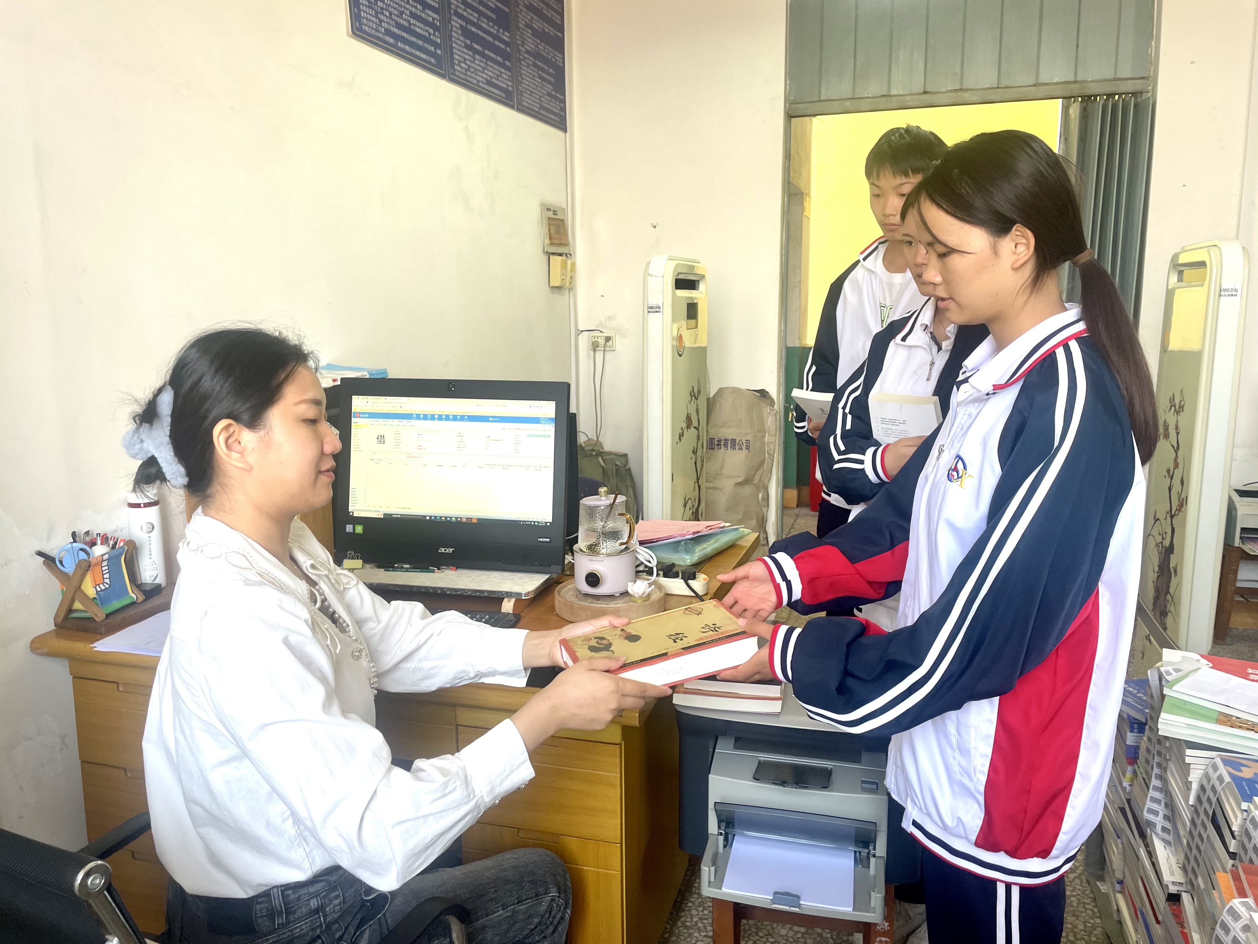 秋日余晖,同学们在图书馆老师指导下借阅中名名著