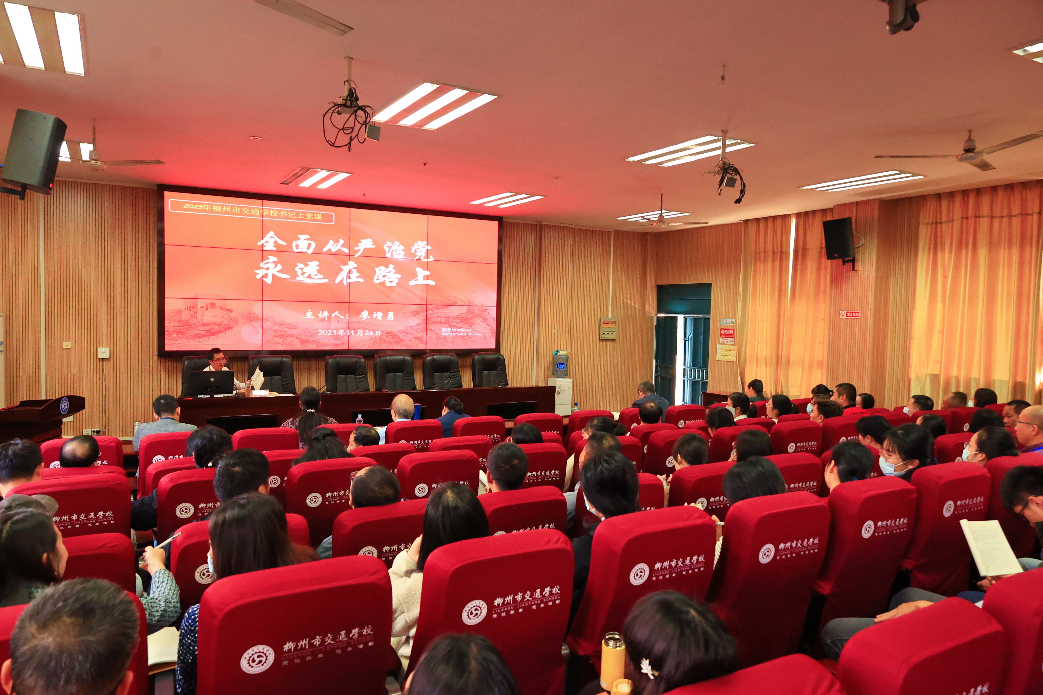 11月24日,柳州市交通学校党委书记廖增勇以“全面从严治党永远在路上”为题,为学校全体党员、发展对象和积极分子讲授专题党课。