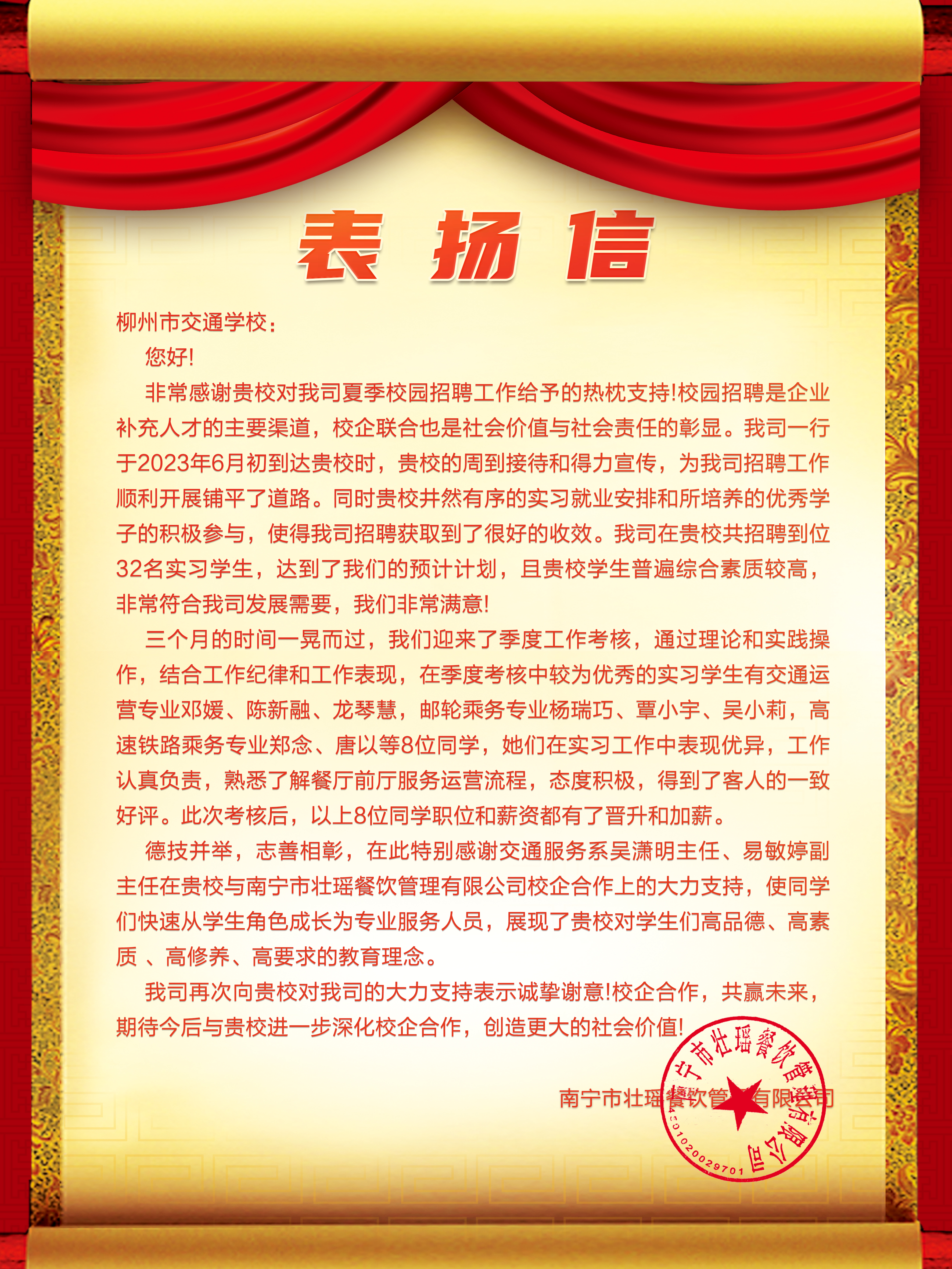 近日,我校一批实习生在南宁壮瑶餐饮管理有限公司实习期间表现出色,赢得了企业的高度评价和感谢。这些实习生在各自领域展现出了卓越的专业素养和勤奋的工作态度,为学校和企业之间的合作关系增添了新的内涵。