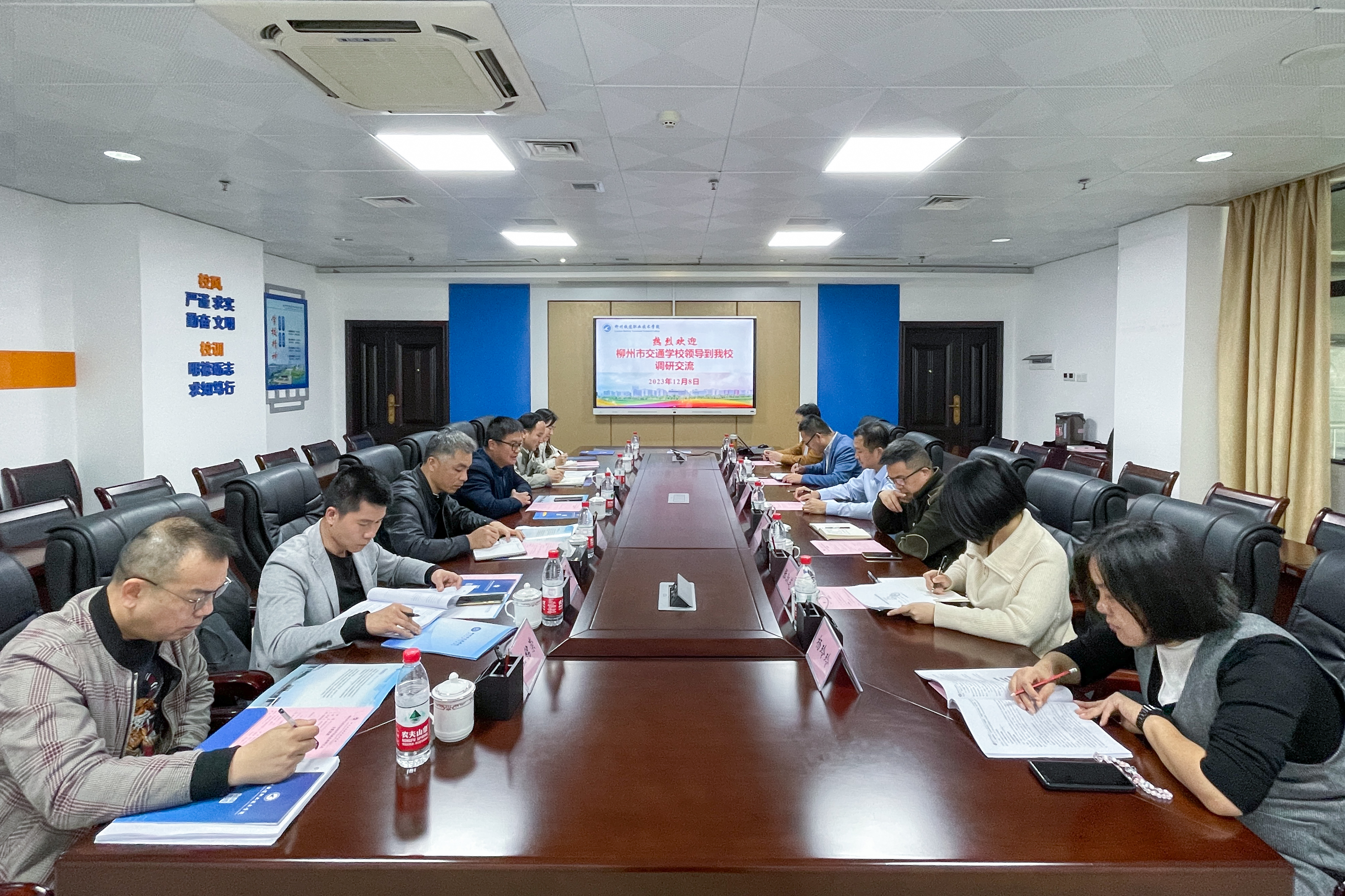 在交流会上,卢副校长向大家分享了铁职院光辉的发展历程,学院创建双高学校的工作经验。交流会后,我校质量办、教科处、招教科、航海系等相关部门负责人分别与铁职院相关科室、院系负责人员进行了个别深入交流。