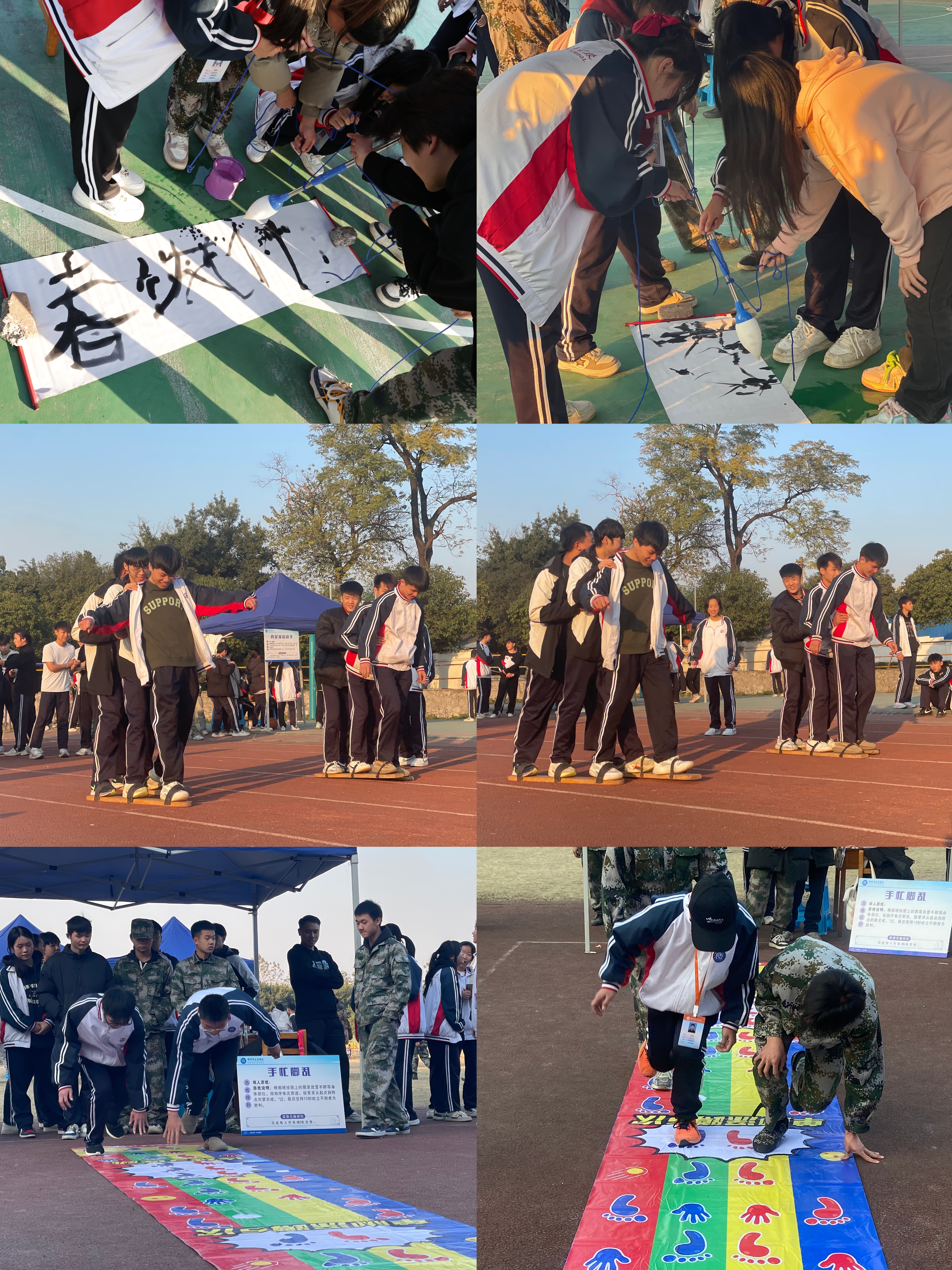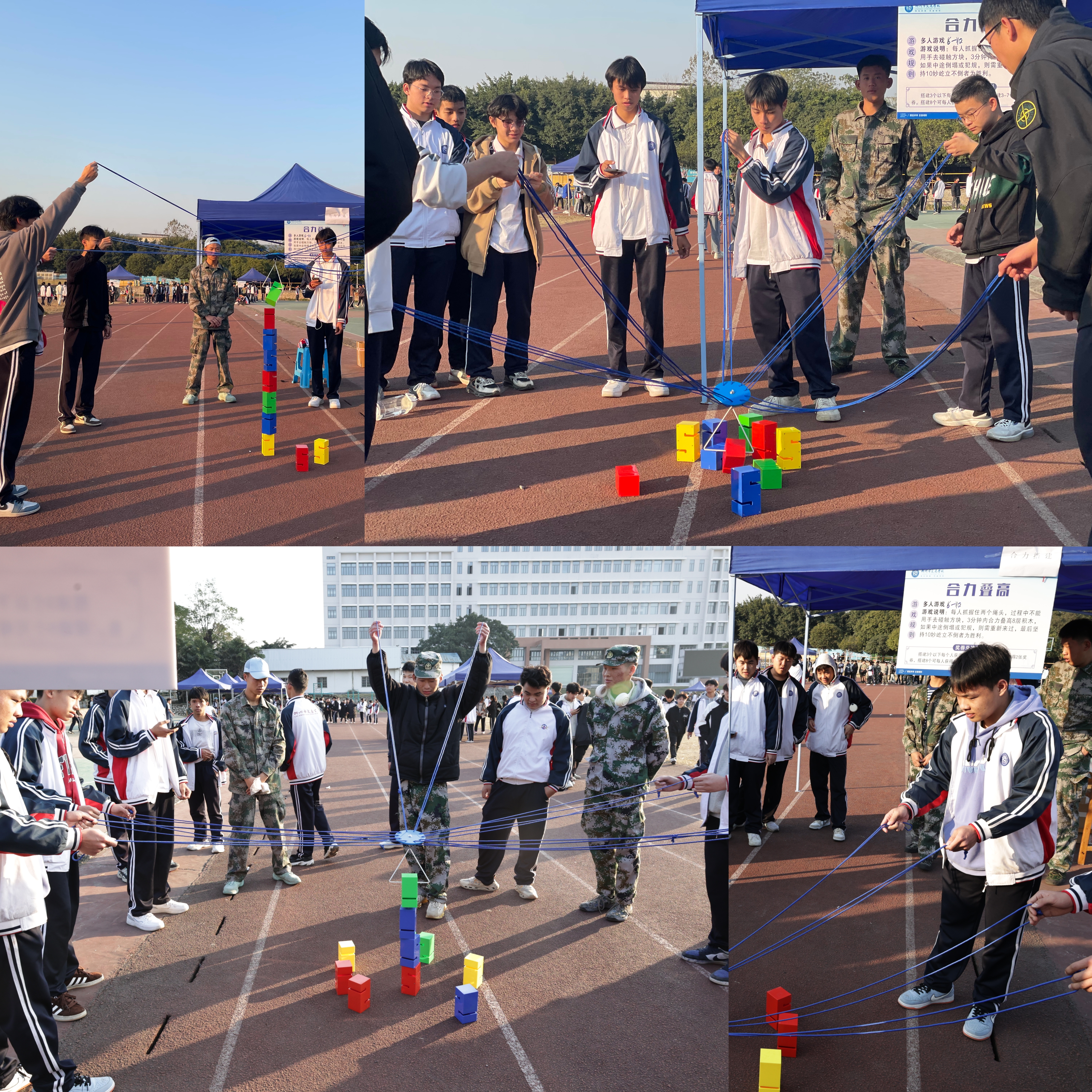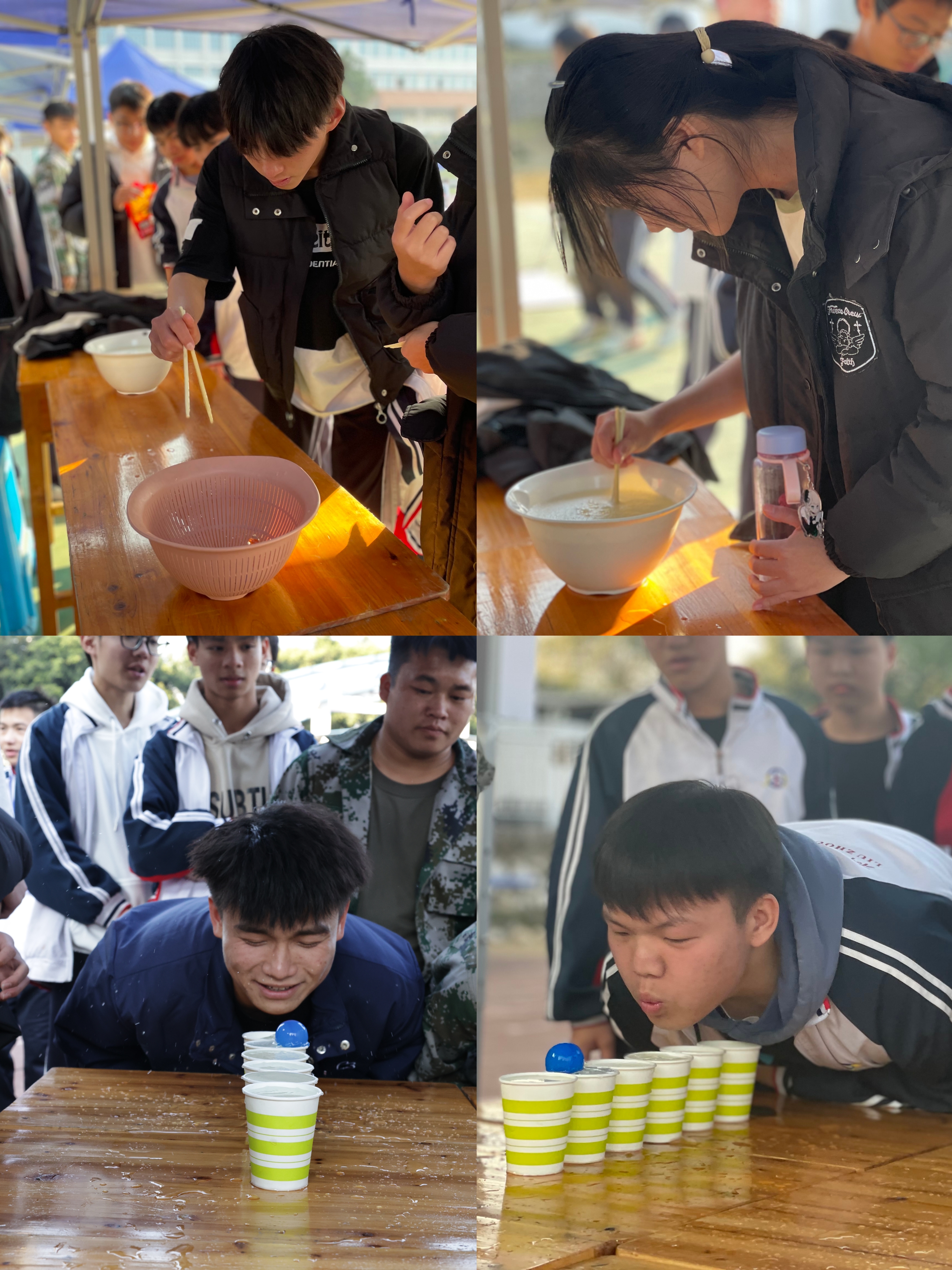 此外,三人板鞋项目需要同学们默契配合,步调一致地穿越障碍;同心击鼓则需要大家齐心协力,共同掌控节奏;速度夹弹珠是一场速度与耐力的较量;呼啦圈转起来让现场充满欢声笑语;鱼跃龙门考验着同学们的跳跃能力;背夹球要求参赛者紧密配合,展现团队力量;屹立不倒和合力叠高则考验着同学们的平衡感和建筑智慧。