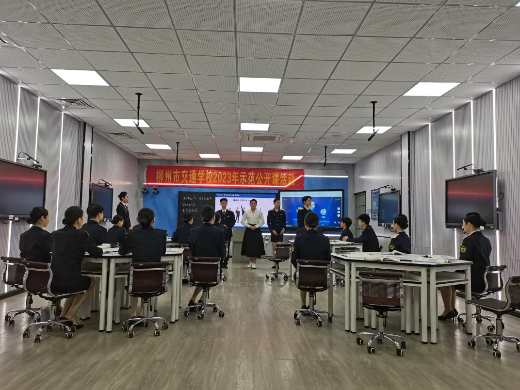 示范课授课教师是交通服务系的黄芸老师,授课课程为《面试技巧》,内容为《集体面试——乘务员面试》,现场授课地点为智慧教室,全体教师在第三报告厅观看直播。